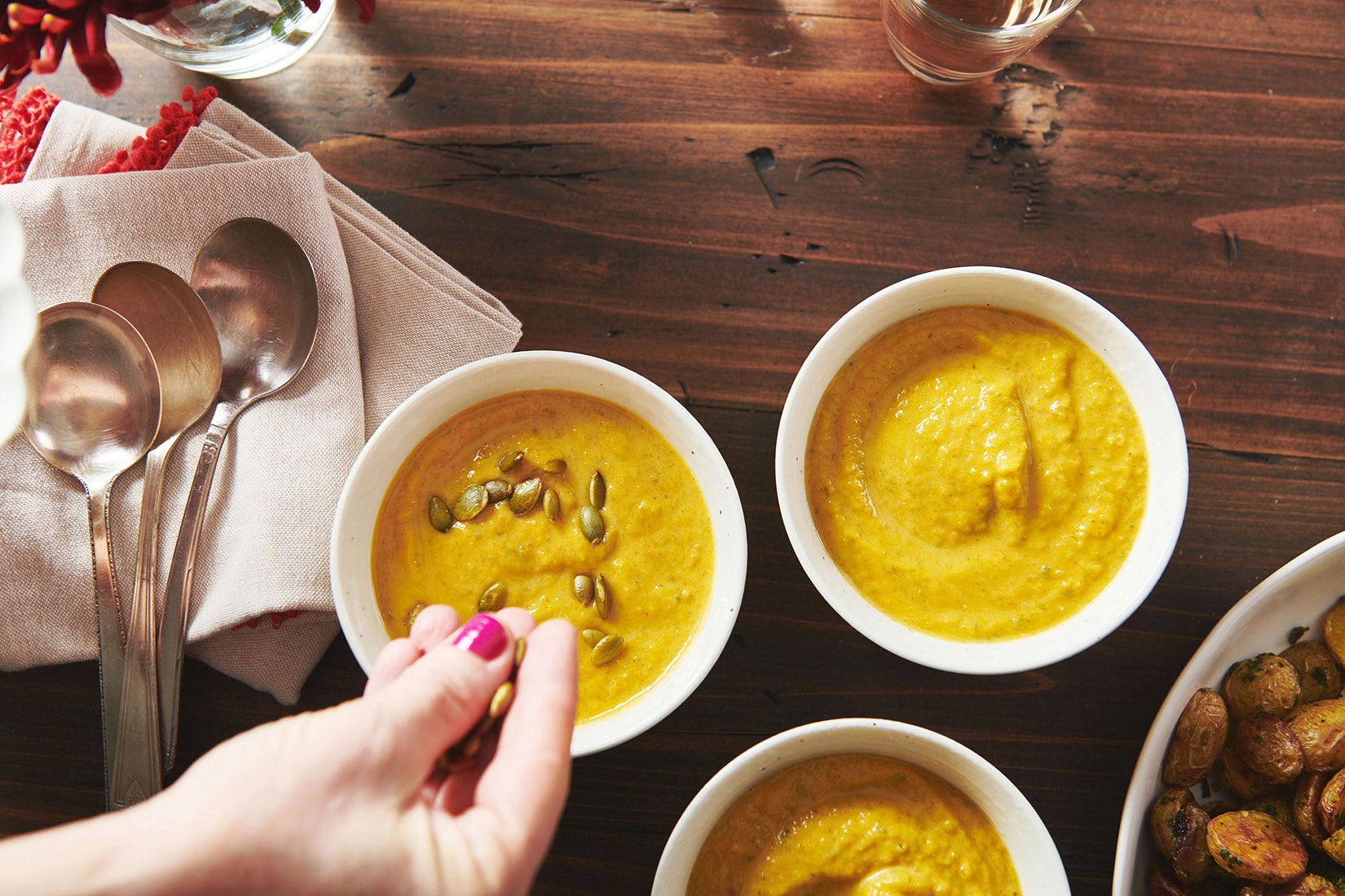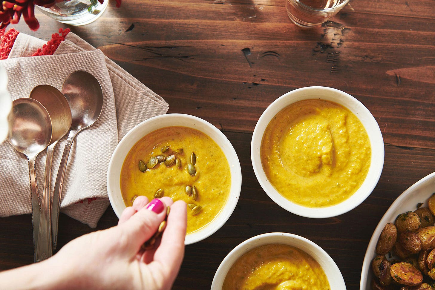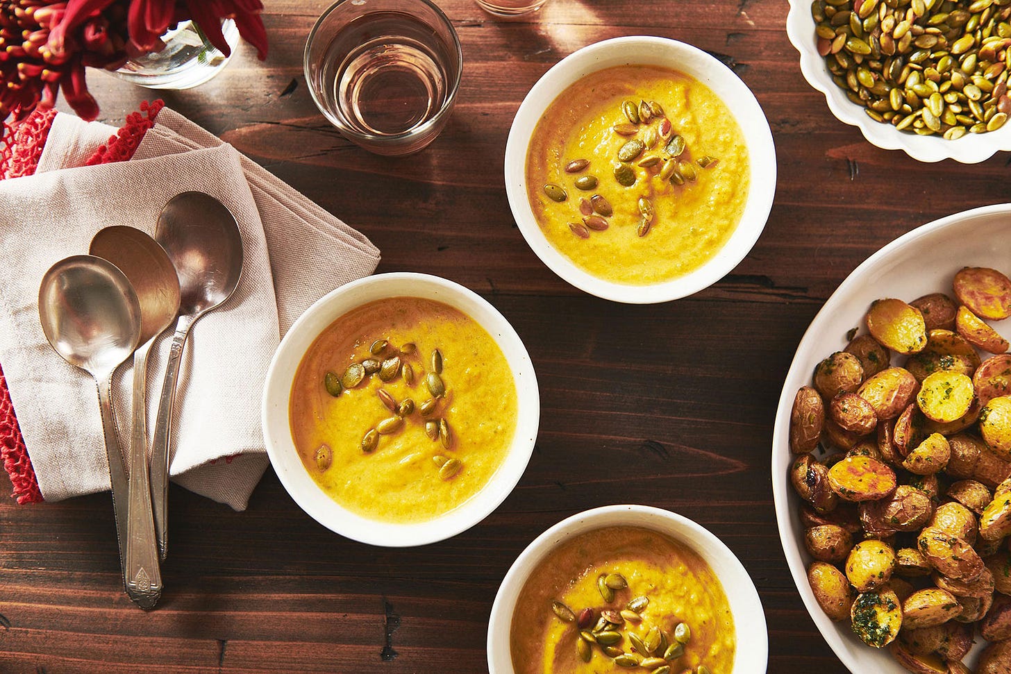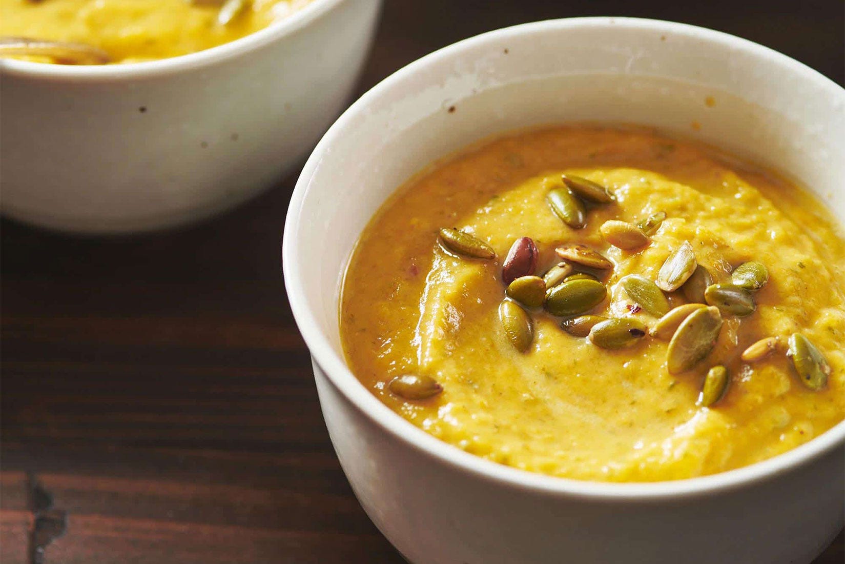 And that sexy looking garnish is pepitas, which are hulled pumpkin seeds, and they add a lovely crunch to contrast with the creaminess of this soothing soup.