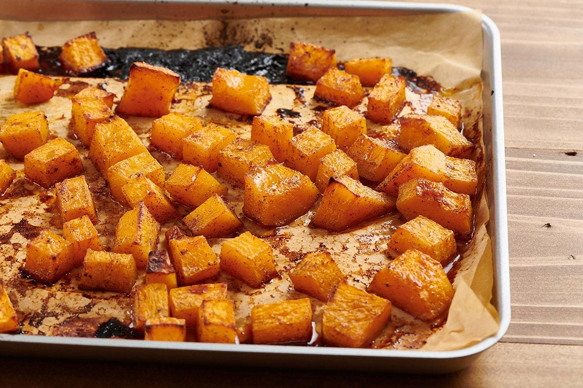 Preheat the oven to 400 F. Spread the squash cubes on a rimmed baking sheet (they will crowd each other; that’s ok, they don’t need to brown, just become tender).